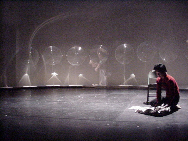 Photo of Luna in rehearsal, with dancer Chi Long in the foreground and the large lenses behind the skrim curtain, December 11, 2000. Photo: Dena Davida.